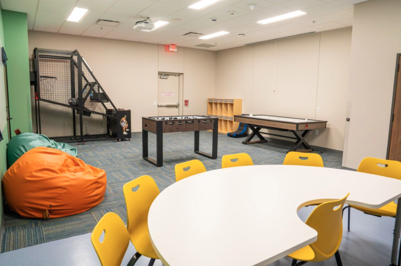 This space is designed for teen and adult participants to socialize and hang out, featuring basketball, air hockey, foosball and more.